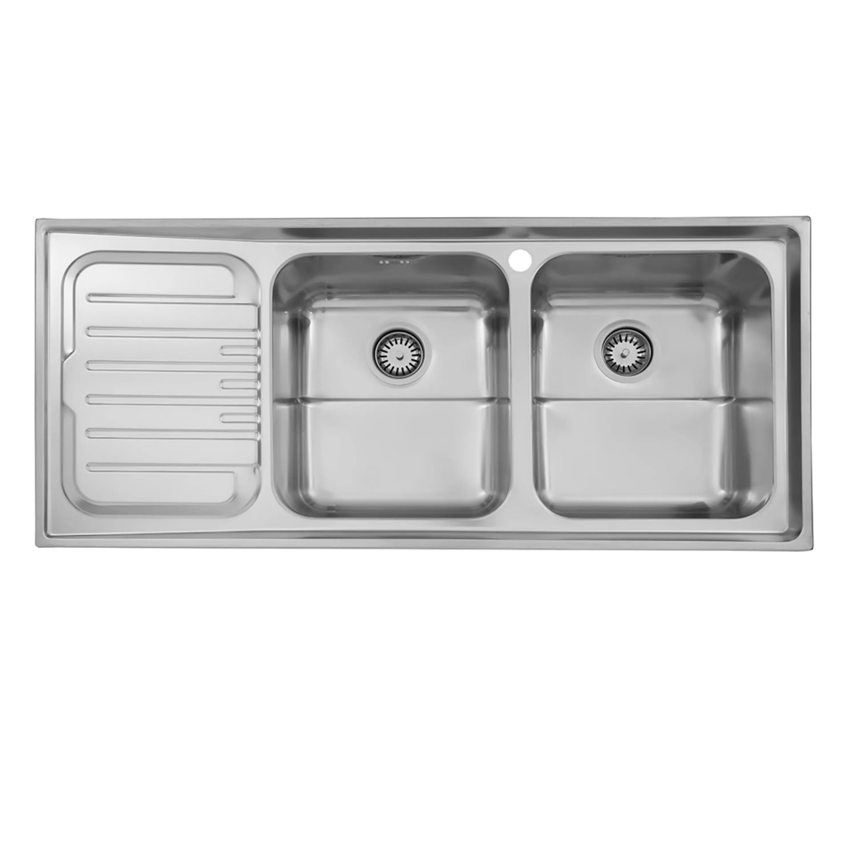 سینک استیل البرز مدل 733 توکار.روکاردارای سایز 116 * 52 سانتی متر با کیفیت مناسب ورق و عمق لگن 20 سانت با ظرفیت مجموع 56 لیتر آب