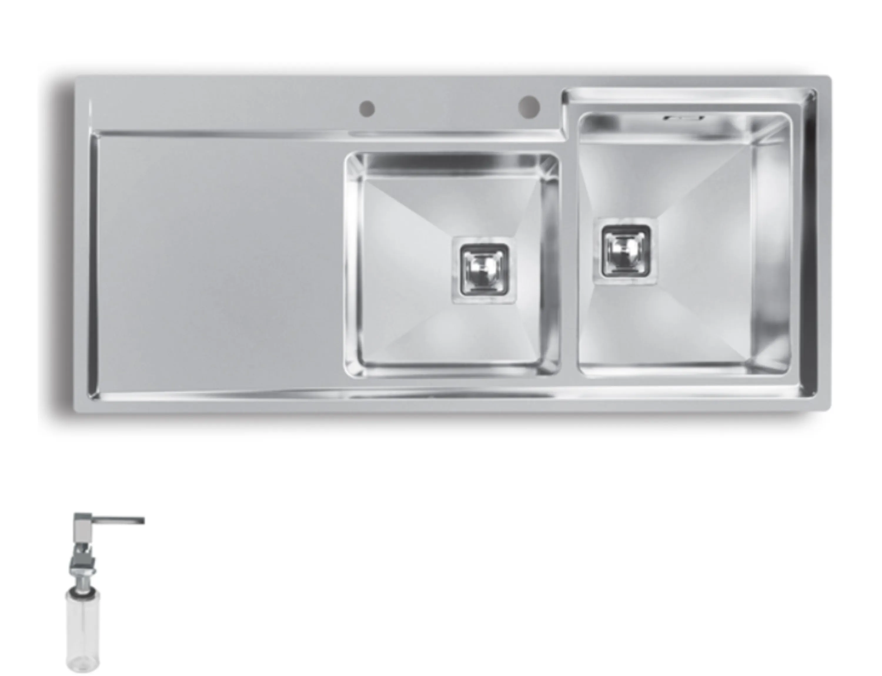این مدل سینک اخوان دارای سبد فلزی، سیفون و زیرآب مربع، نوار آب بندی، سبد میوه شور فلزی،جامایع، و تخته گوشت شیشه ای می باشد