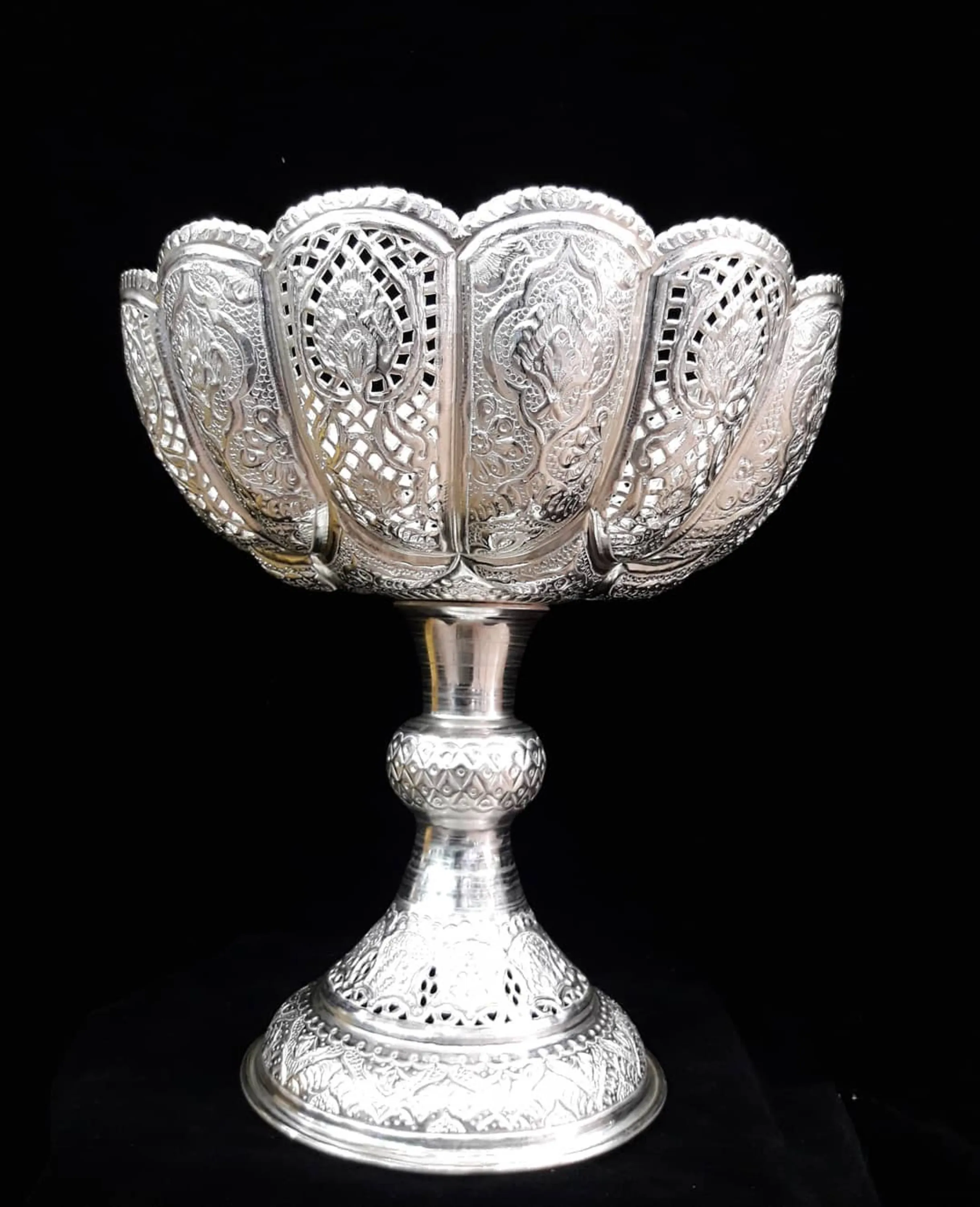 کاسه دهنه 33سانتی قلی کعب دار ارتفاع 32سانت قلم گل و بوته شبکه اب نقره