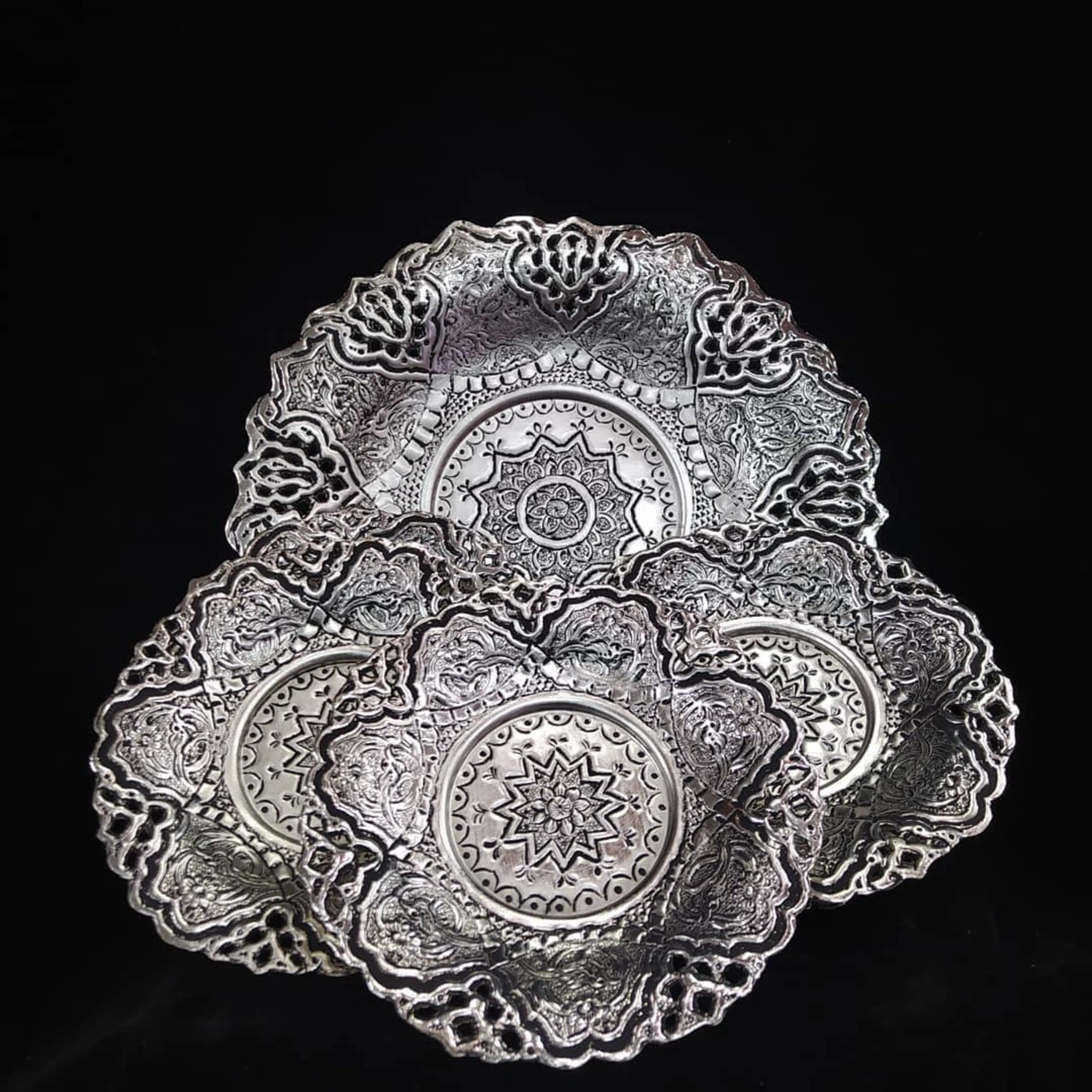 شیرینی خوری هفت تیکه گرد سه پایه قلم گل مرغ و شبکه اب نقره سیاه قلم