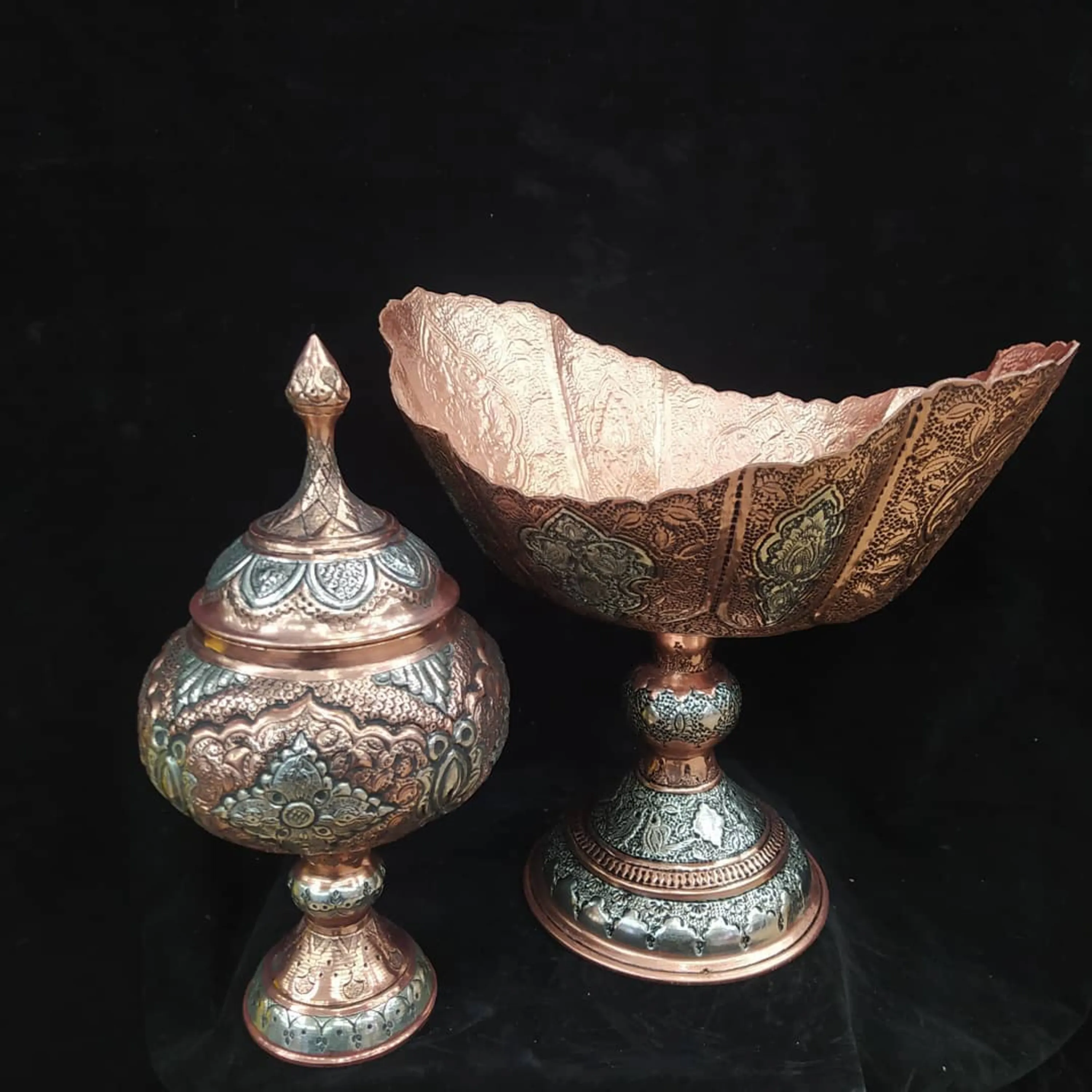 کاسه کشکول سایز 1کعب دار و قندون 26 سانتی اب دورنگ خورده سیاه قلم