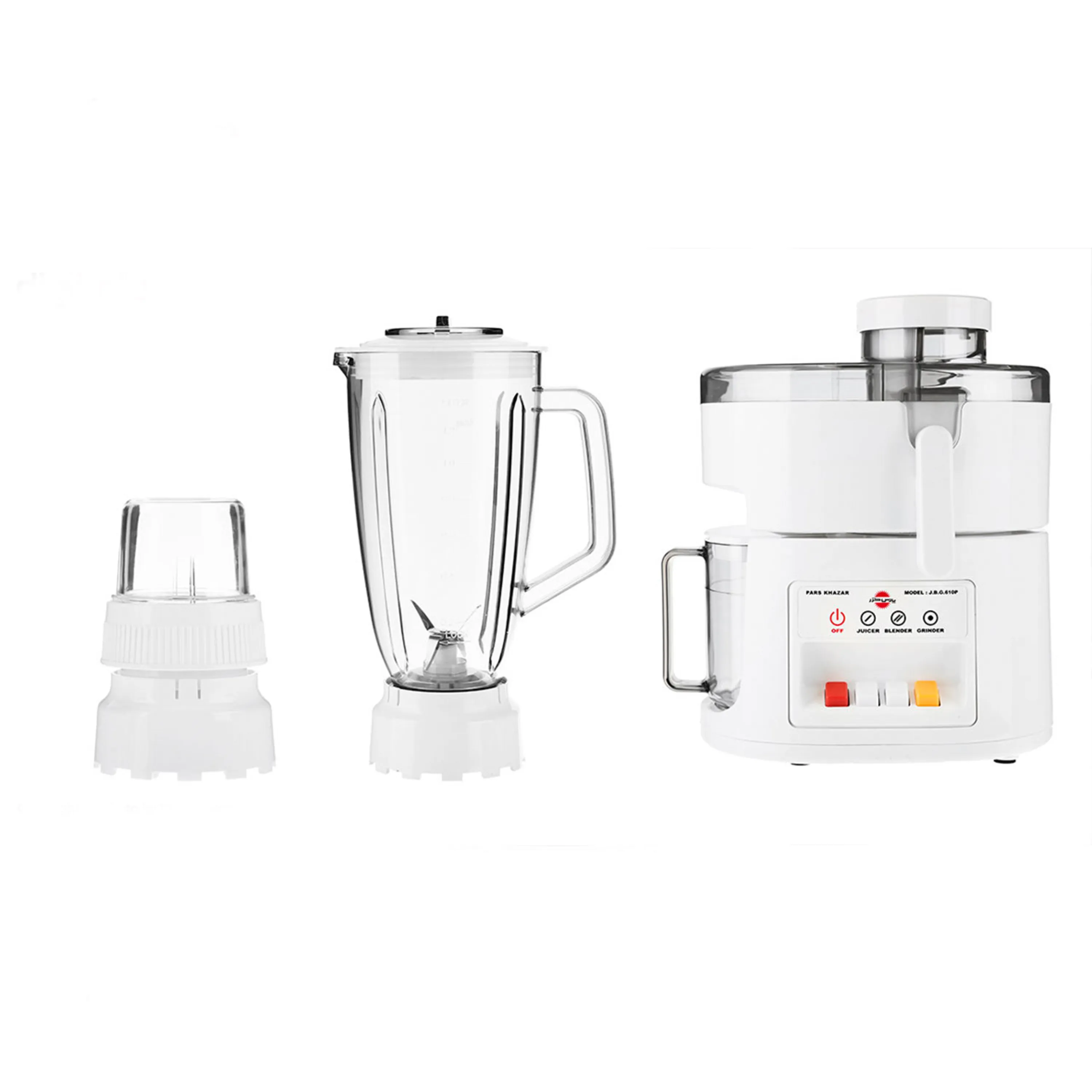 آب میوه گیری پارس خزر مدل JBG-610P محصولی است پر کاربرد برای تمام فصول و از سری دستگاههای چندکارهی پارس خزر است که طرفداران زیادی دارد. موتور پرقدرت آن توان 300 وات، تکنولوژی فرانسه و ایتالیا است. جنس بدنه اصلی پلاستیک است که وزن دستگاه را کاهش میدهد. فیلتر و تیغه جدا کننده تفاله ها از استیل ضدزنگ است که تقریبا هر چیزی را خرد و مخلوط میکند. آسیاب همراه پارس خزر مدل JBG-610P نیز با دارا بودن تیغههای قدرتمند میتواند هر چیزی را خردکرده و پودرهای متنوعی را جهت استفاده کابران تهیه کند. برای هرکدام از این عملکردها دکمهای مجزا در نظر گرفتهشده که در جلوی دستگاه در دسترس است.