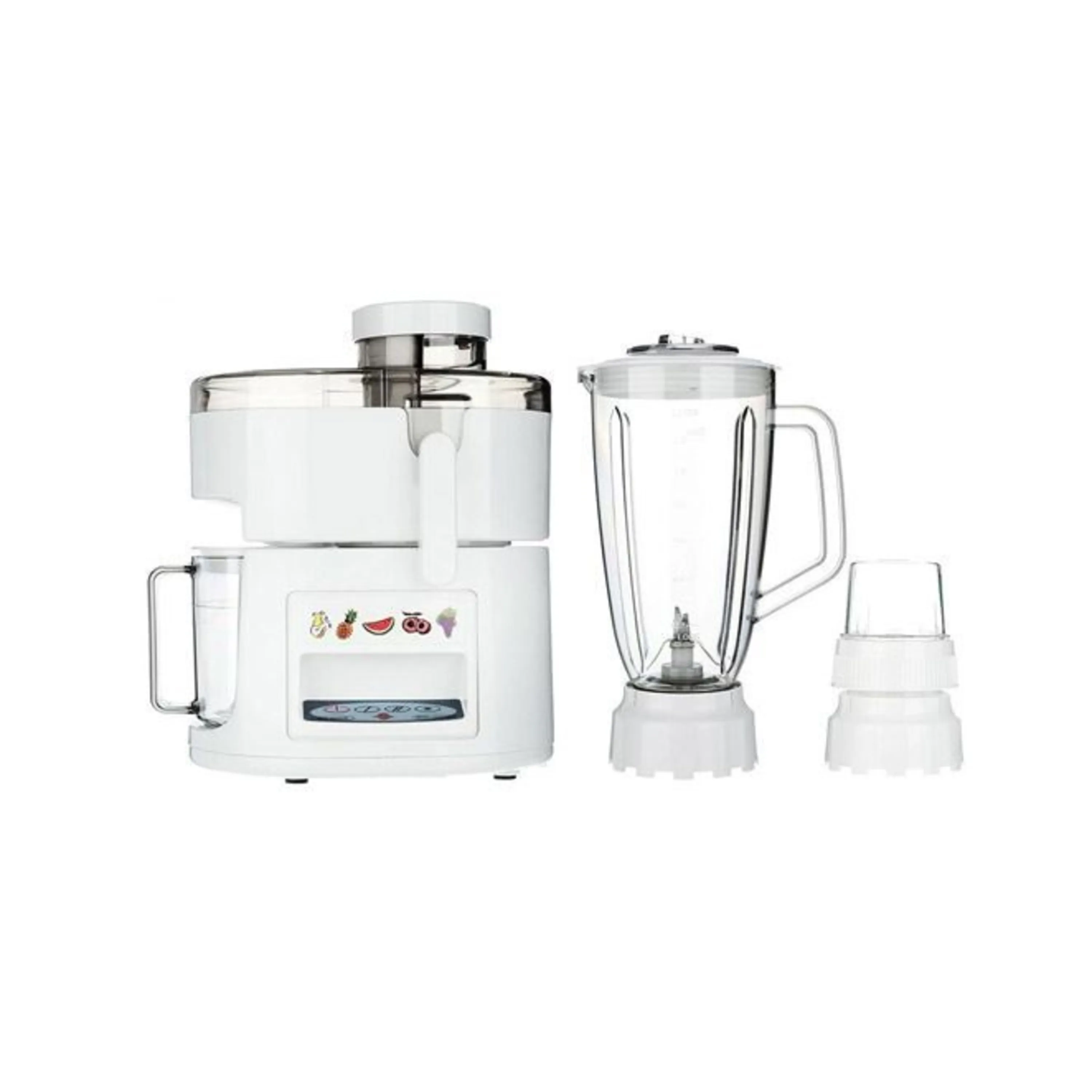 همراه این دستگاه یک عدد مخلوط کن با ظرفیت معمولی و جنس پلاستیک عرضه می گردد. همچنین یک عدد آسیاب مواد خشک نیز همراه این دستگاه است که با آن می توان اکثر گیاهان خشک و دانه های روغنی را خرد و آسیاب نمود. کاردک همراه دستگاه می تواند در خالی کردن تفاله های میوه از آبمیوه گیری و یا هم زدن مواد داخل مخلوط کن و یا حتی خارج کردن مواد آسیاب شده از داخل آسیاب کمک کند.