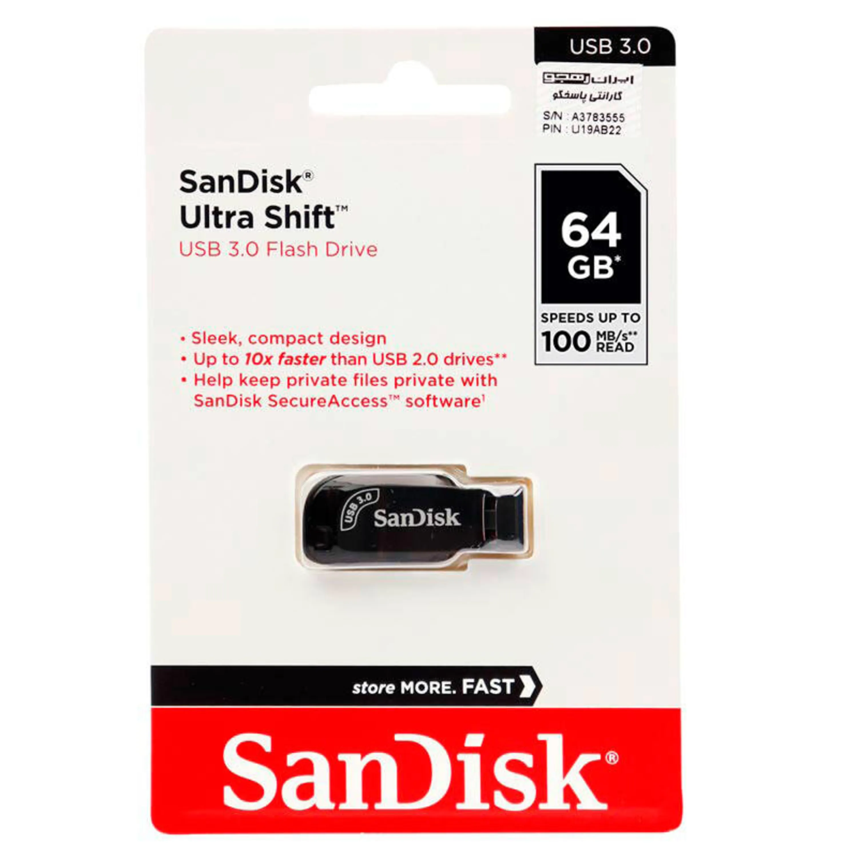 فلش مدل Ultra Shift برند سن دیسک با بدنه ای از جنس پلاستیک سخت ساخته شده که مقاومت بالایی در برابر آسیب های احتمالی برای حفاظت داده ها از خود نشان می دهد. این حافظه با ظرفیت 64 گیگابایتی، می تواند فضای کافی برای انتقال و ذخیره امن تصاویر، ویدئوهای پرحجم و دیگر فایل ها فراهم نماید. این فلش مموری از رابط USB 3.0 با حداکثر سرعت خواندن 100 مگابایت بر ثانیه پشتیبانی می کند که نسبت به نسخه های قبلی، سرعت انتقال فایل ها 10 برابر بیشتر و در کمترین زمان ممکن انجام می شود. یک شیار نیز بر روی بدنه وجود دارد که امکان اتصال به بند و آویز را امکانپذیر می کند تا از گم شدن این ابزار ذخیره سازی کوچک جلوگیری گردد. نرم افزار SanDisk Secure Access به طور رایگان در دسترس کاربر قرار گرفته تا فایل های مهم خود را کدگذاری کرده و نسبت به امنیت بالاتر داده های ذخیره شده خود نگرانی نداشته باشد.