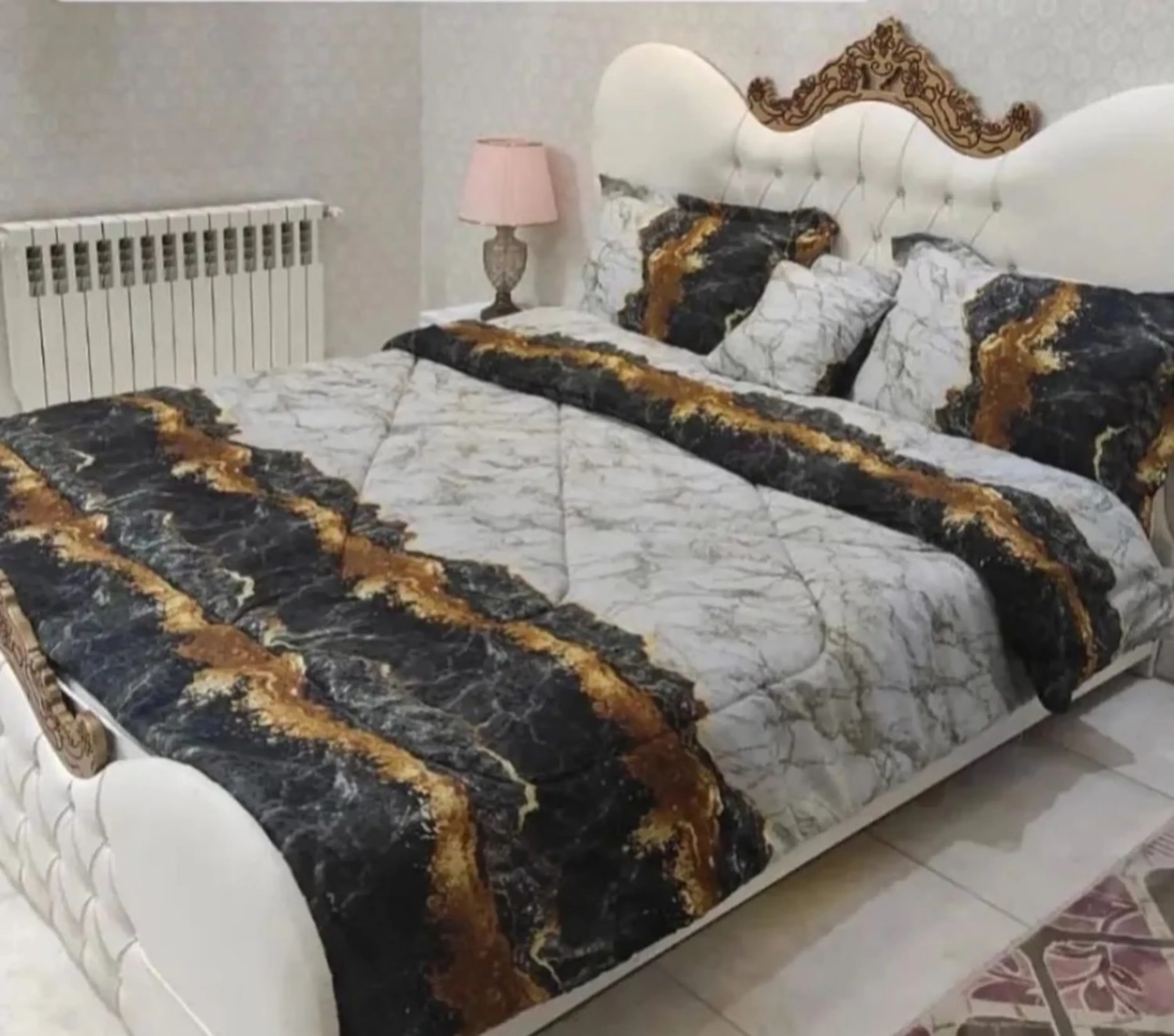 2 عدد رو بالشتی. 2 عدد رو کوسنی. 1 عدد روکش 4 طرف کش برای خوشخواب. 1 عدد لحاف رو انداز 2 رو با الیاف 300 گرمی. رنگ ثابت و بدون آبرفت. دوخت cnc .